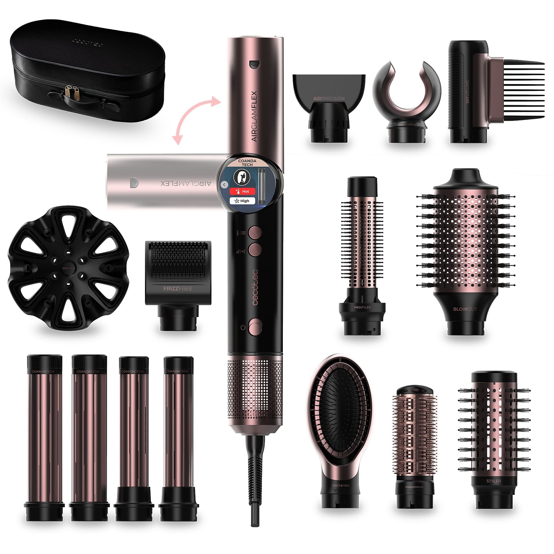 Cecotec AirGlam 14in1 Flex Black, 14 Cabezales intercambiables, Revestimiento cerámica y queratina, Negro