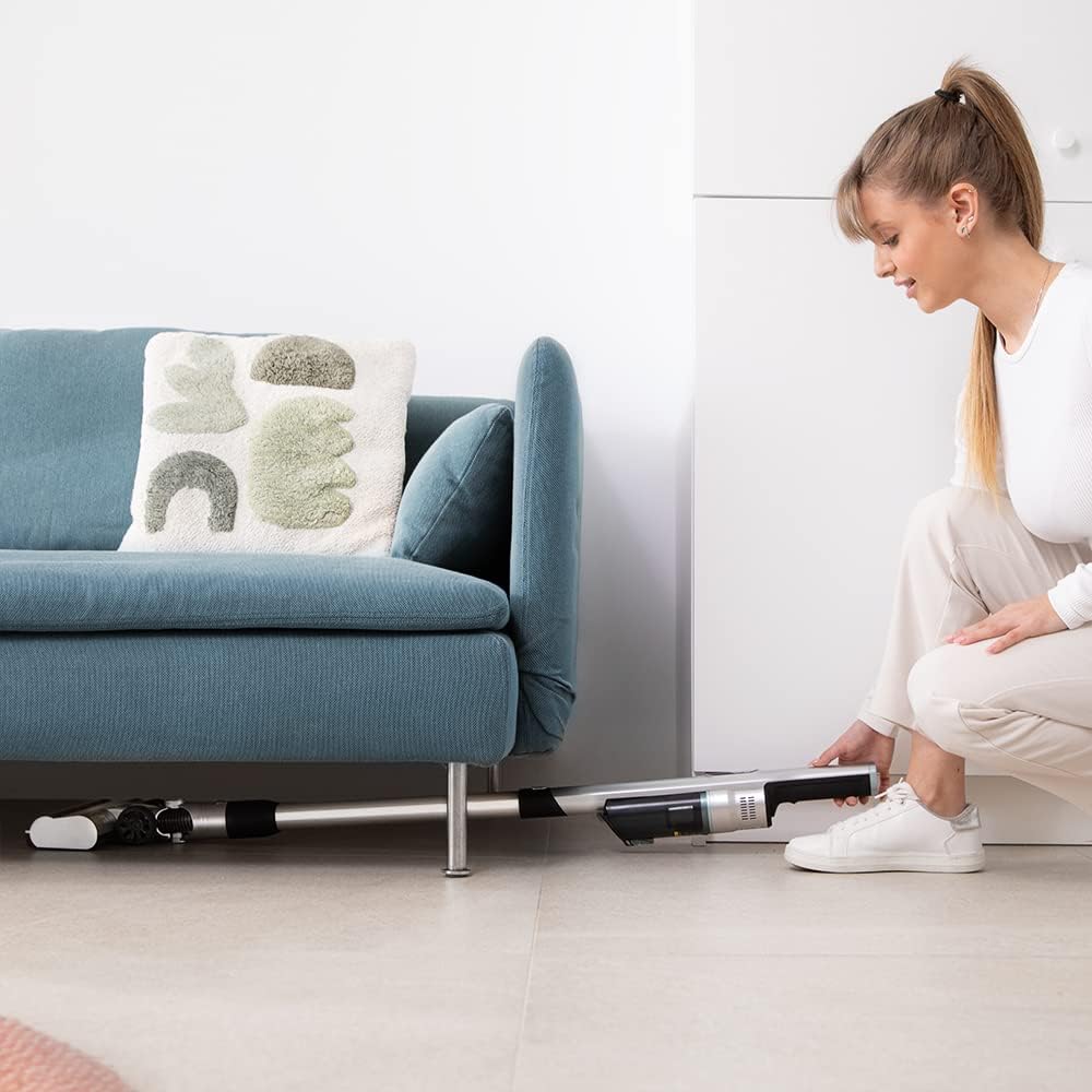 - Diseño ultraligero 2 en 1 que permite su uso como aspirador vertical y de mano (0,73 kg en mano y 1,55 entero) para limpiar de la forma más cómoda hasta el último rincón.