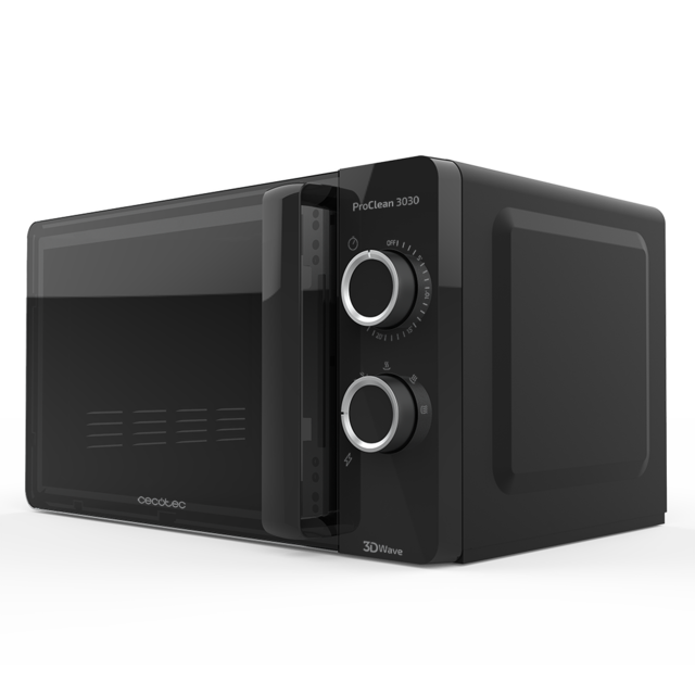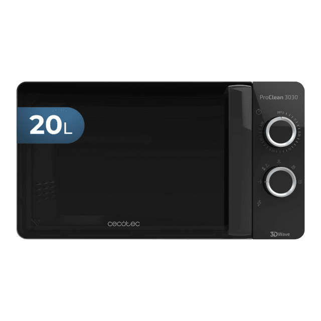 Microondas negro con revestimiento Ready2Clean para una mejor limpieza. Tecnología 3DWave, input 1150 W, output 700 W. 20 l. Diseño elegante con Puerta FullCrystal y detalles metálicos. 6 niveles. ProClean 3030 de Cecotec.