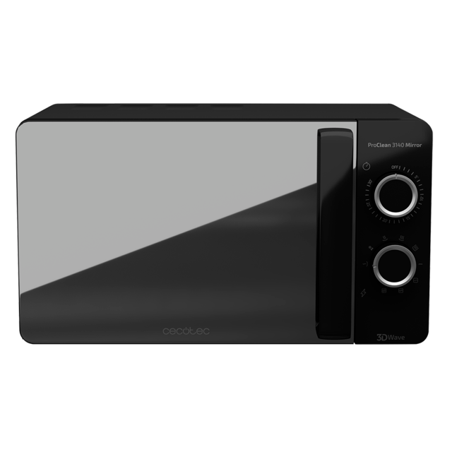 Microondas negro con Grill y con revestimiento Ready2Clean para una mejor limpieza. Tecnología 3DWave, input 1150 W, output 700 W. 20 l. Diseño elegante con Frontal MirrorDoor y detalles metálicos. 6 niveles. ProClean 3140 Mirror de Cecotec.